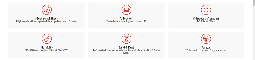 These include Mechanical Shock, Vibration, Shipboard Vibration, Humidity, Sand & Dust, Fungus, Altitude, Solar Radiation, Explore Atmosphere, Low Temperature, High Temperature and Extreme Temperature.